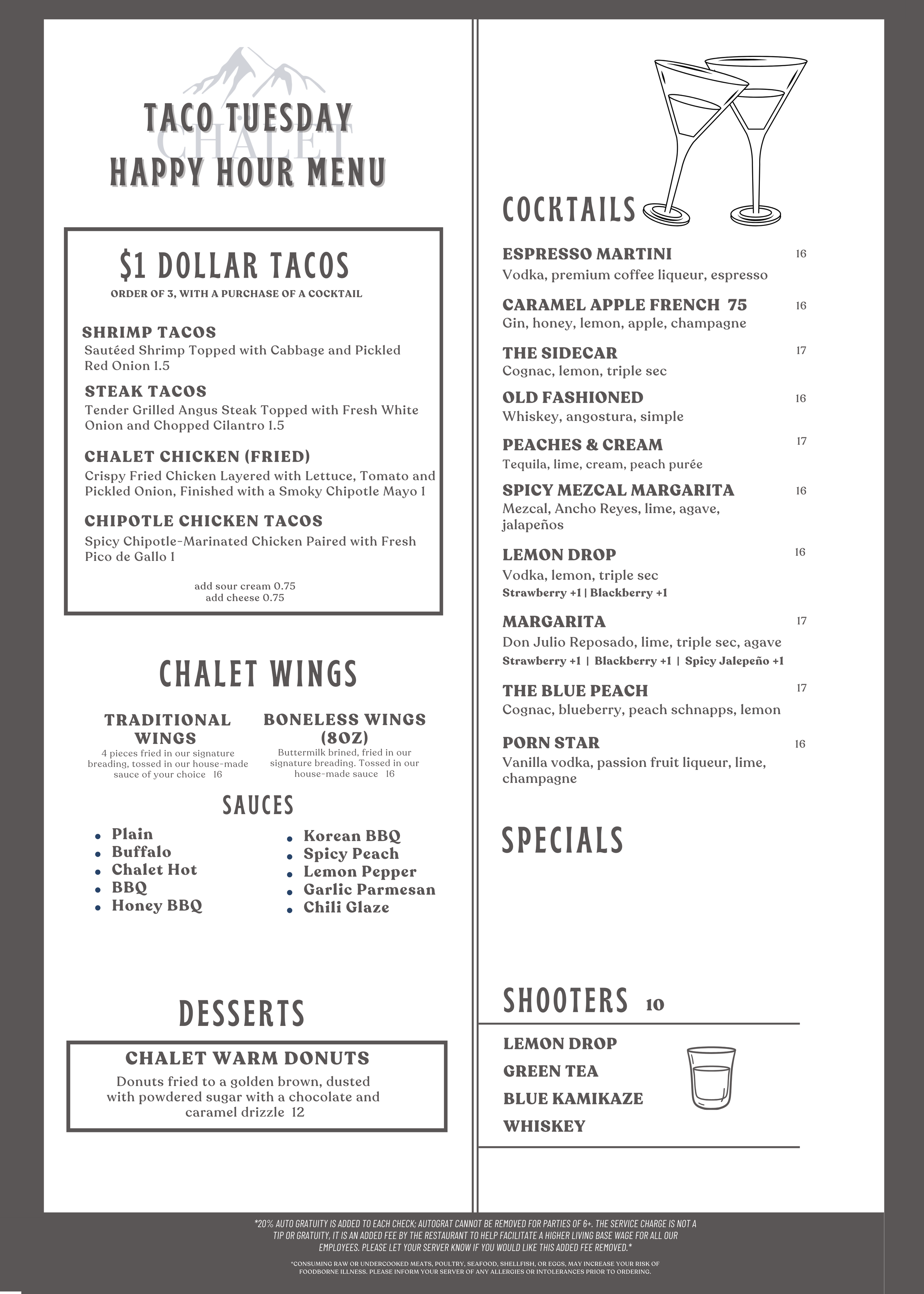 Taco Tuesday Tuesday, October 14, 2025 4:00 PM 6:00 PM Google Calendar ICS Every Tuesday from 4–6PM, enjoy $1 tacos at Chalet during Happy Hour. Mix and match your favorites (minimum 3, drink purchase required) and pair them with $7 reposado shots or $10 margaritas. Reserve Your Table
